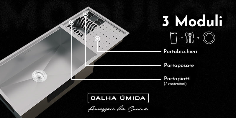 Dotato di un sofisticato scolapiatti a 3 moduli: