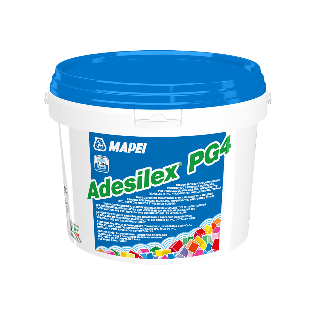 Adesivo epossidico bicomponente tixotropico a reologia modificata per l'incollaggio di MAPEBAND, MAPEBAND TPE, nastri in PVC, Hypalon e per incollaggi strutturali.