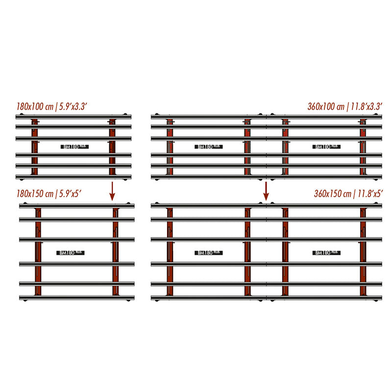 + La lunghezza del piano è di 180 cm (5,97). Unendo due tavoli si ottiene un piano lungo 360 cm (11,87) (e variabile da 100 a 150 cm = 3,3º a 5), questa caratteristica rende il BM180 PLUS la postazione di lavoro perfetta per piatti di qualsiasi dimensione.