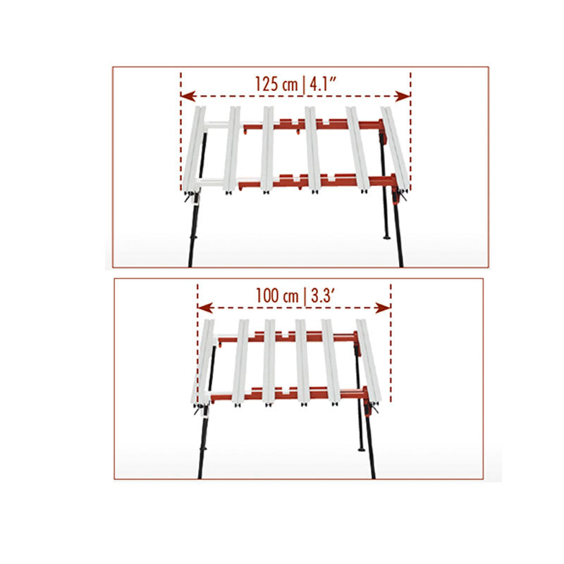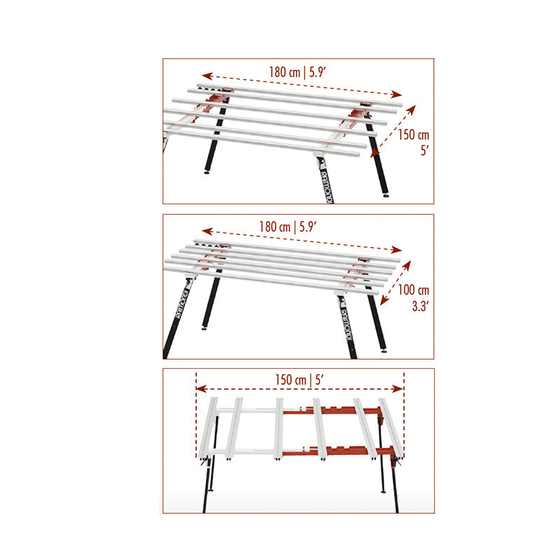 + Con pochi semplici movimenti la larghezza del piano di lavoro può variare da un minimo di 100 cm (3,37) ad un massimo di 150 cm (5) con step intermedi.