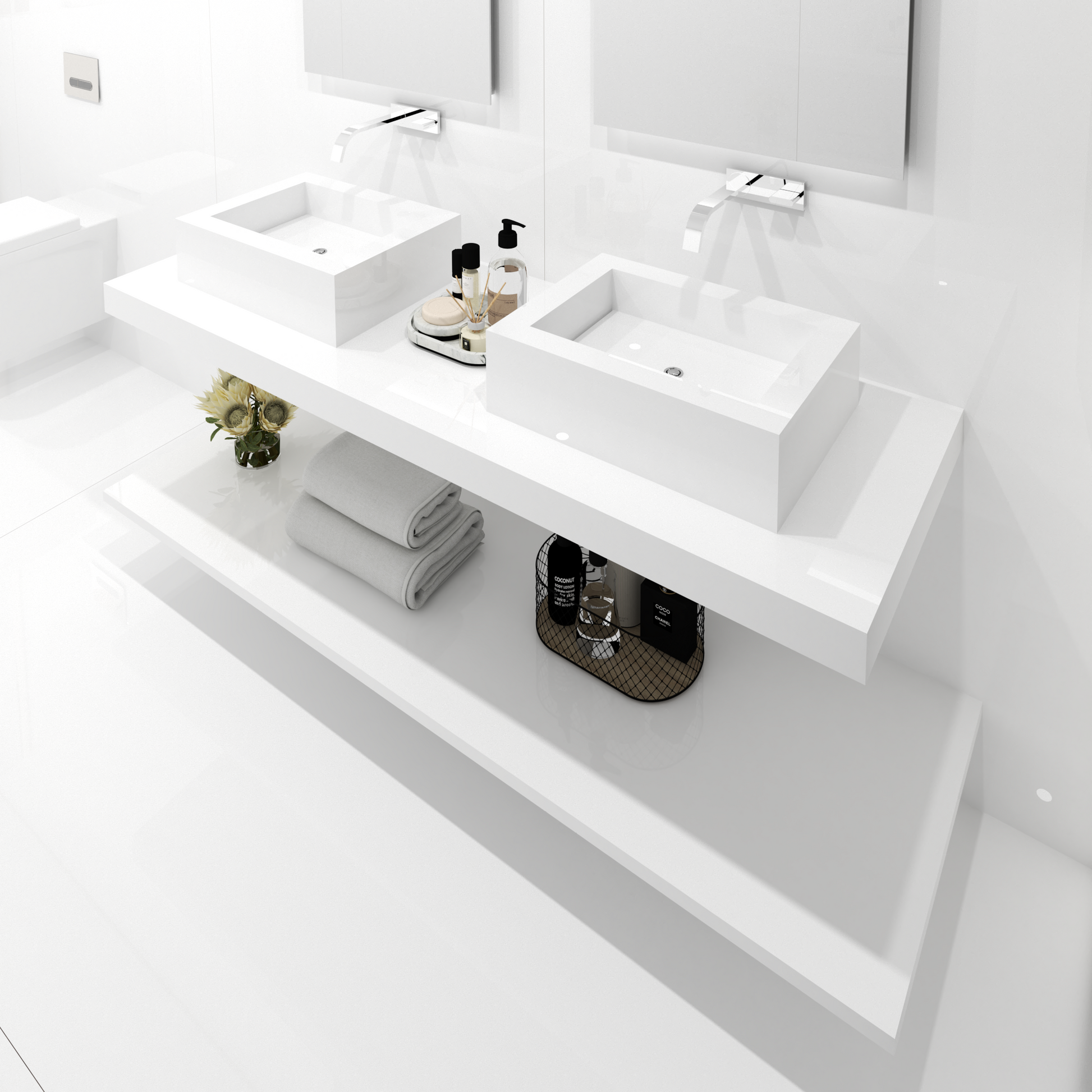 Observação: Ao adquirir nossa bancada, tenha a opção de adicionar uma prateleira inferior por um preço especial. As nossas prateleiras são projetadas para combinar perfeitamente com a bancada, proporcionando um espaço adicional elegante e prático para organizar seus produtos de higiene pessoal, toalhas e acessórios.