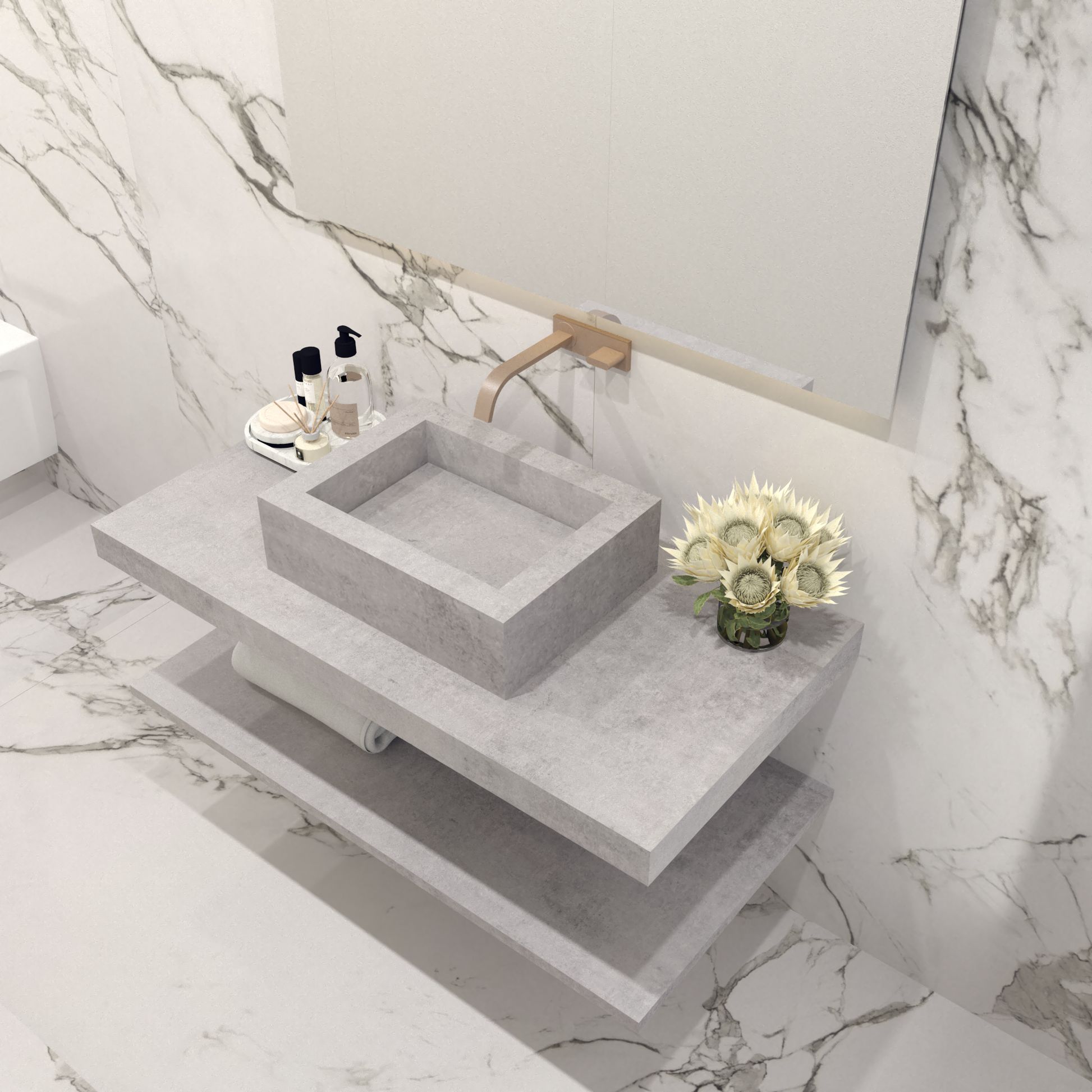 Observação: Ao adquirir nossa bancada, tenha a opção de adicionar uma prateleira inferior por um preço especial. As nossas prateleiras são projetadas para combinar perfeitamente com a bancada, proporcionando um espaço adicional elegante e prático para organizar seus produtos de higiene pessoal, toalhas e acessórios.