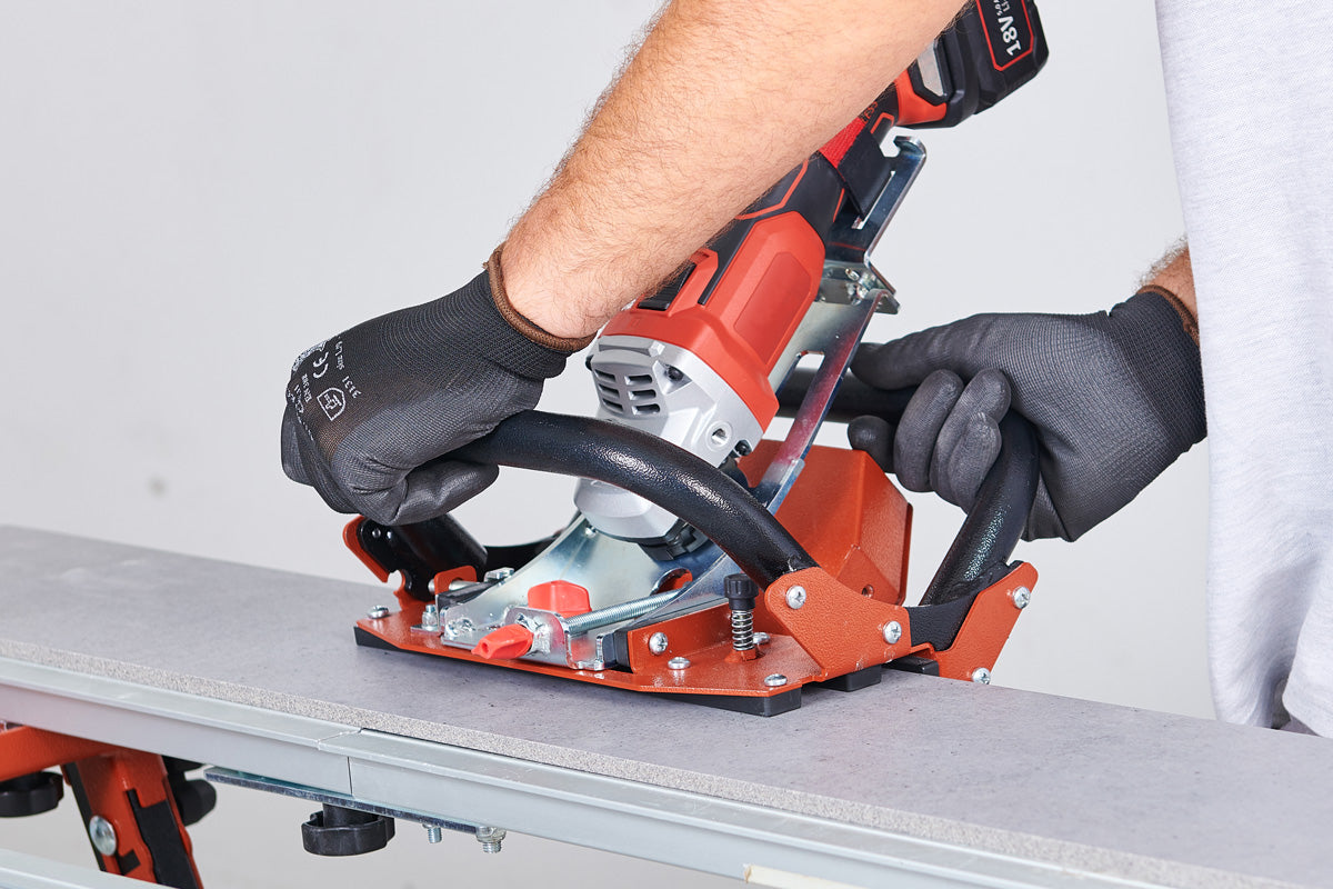 O funcionamento do dispositivo é caracterizado pela inclinação e deslizamento na extremidade do azulejo (ou porcelanato): Isto garante uma execução rápida e precisa e permite trabalhar sem qualquer limite de comprimento.