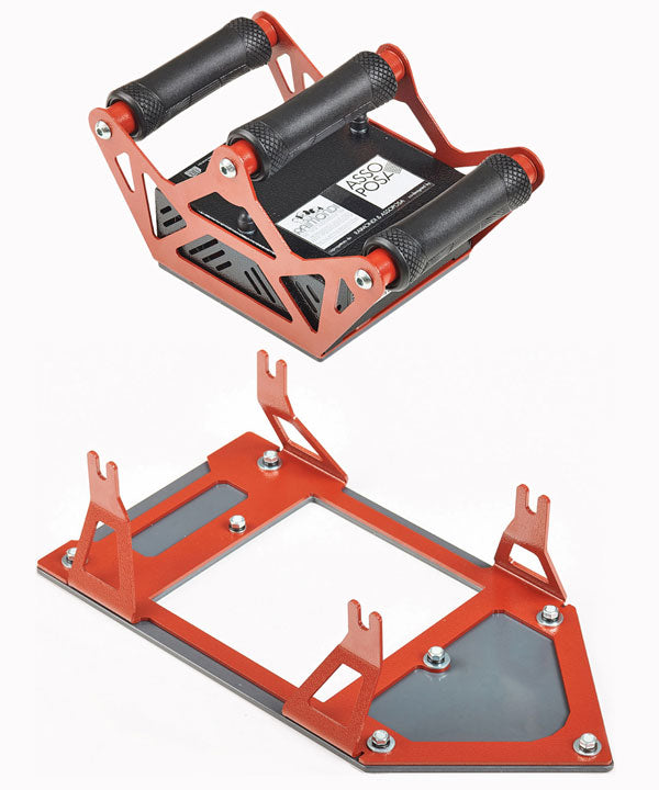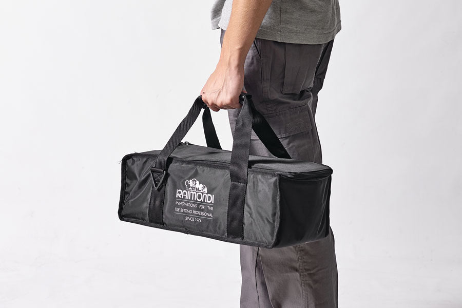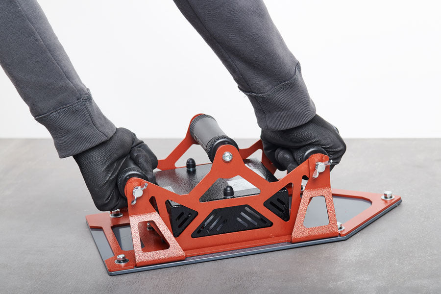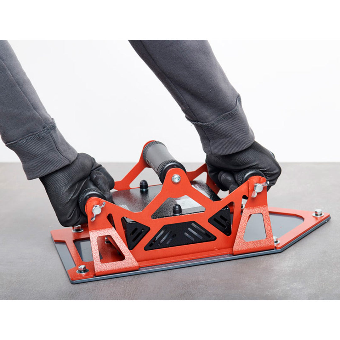 Vibrador profissional sem fio projetado para vibrar ladrilhos de grande formato a fim de retirar o ar por baixo da placa (evitando bolsas de ar) de modo a obter uma colagem perfeita perfeita.