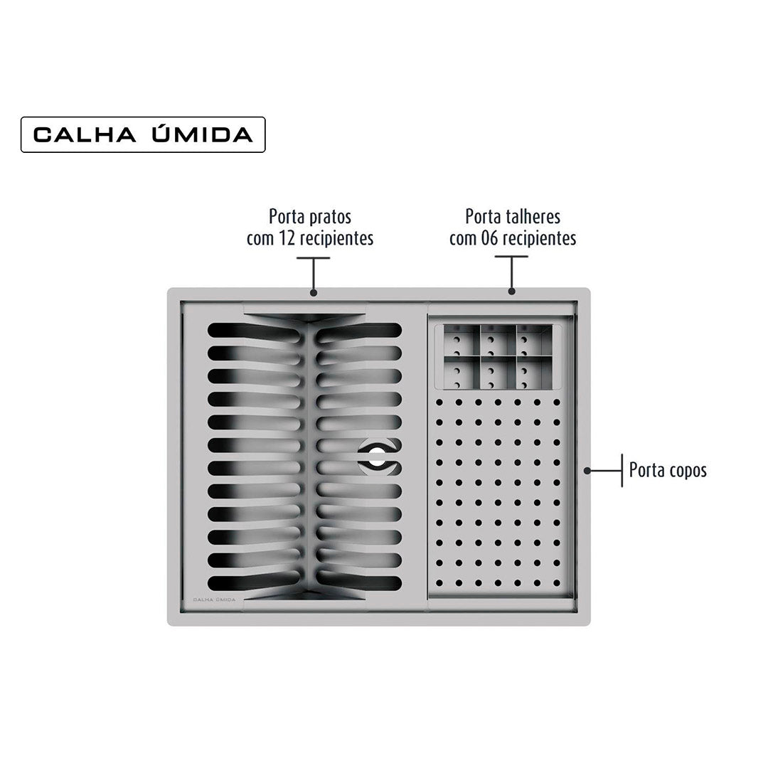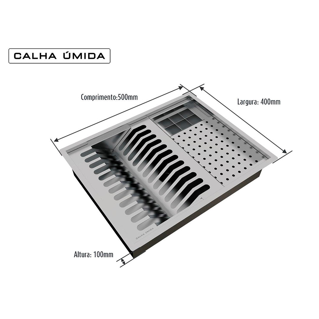 Tradicionalmente conhecido como escorredor de louças, a calha úmida vai completar sua cozinha e espaço gourmet. A linha Kitchen 6 módulos traz praticidade e sofisticação para seu projeto, podendo ser instalada no granito, corian, madeira, cerâmicos, silestone, e outros materiais. Instalação sobreposta ou embutida sob o tampo. A calha irá coletar toda água dos escorredores e escoará diretamente pelo esgoto através de um dreno (acompanha o produto) no centro da peça o qual poderá ser ligado no sifão da cuba ou em um ponto exclusivo de esgoto para calha.