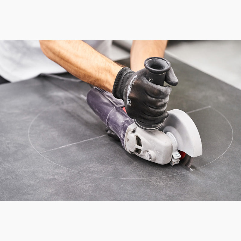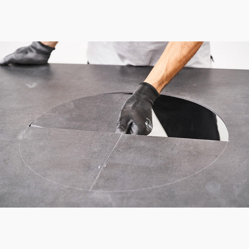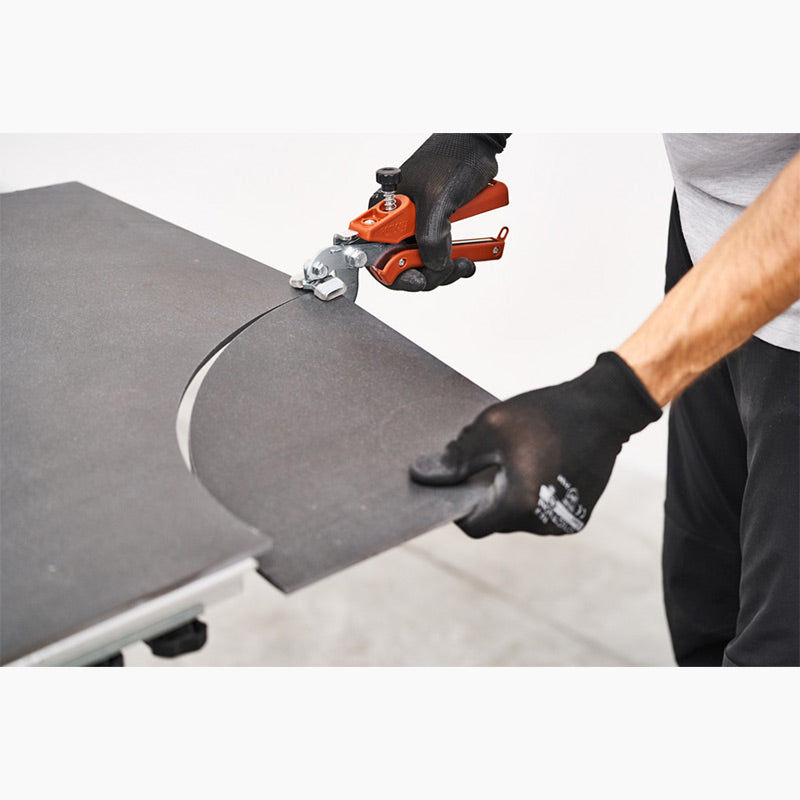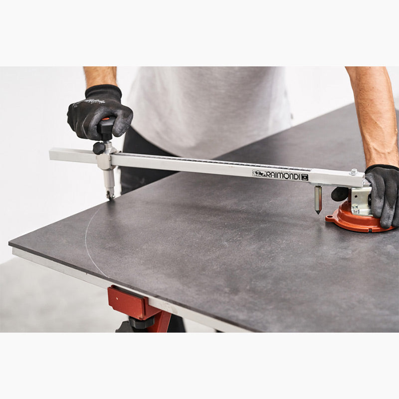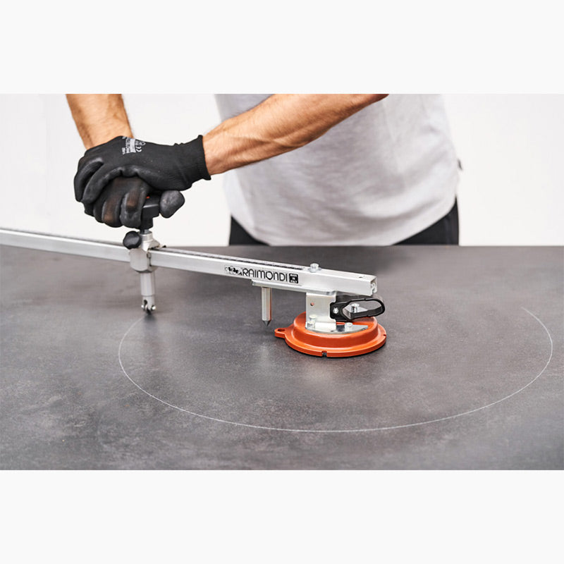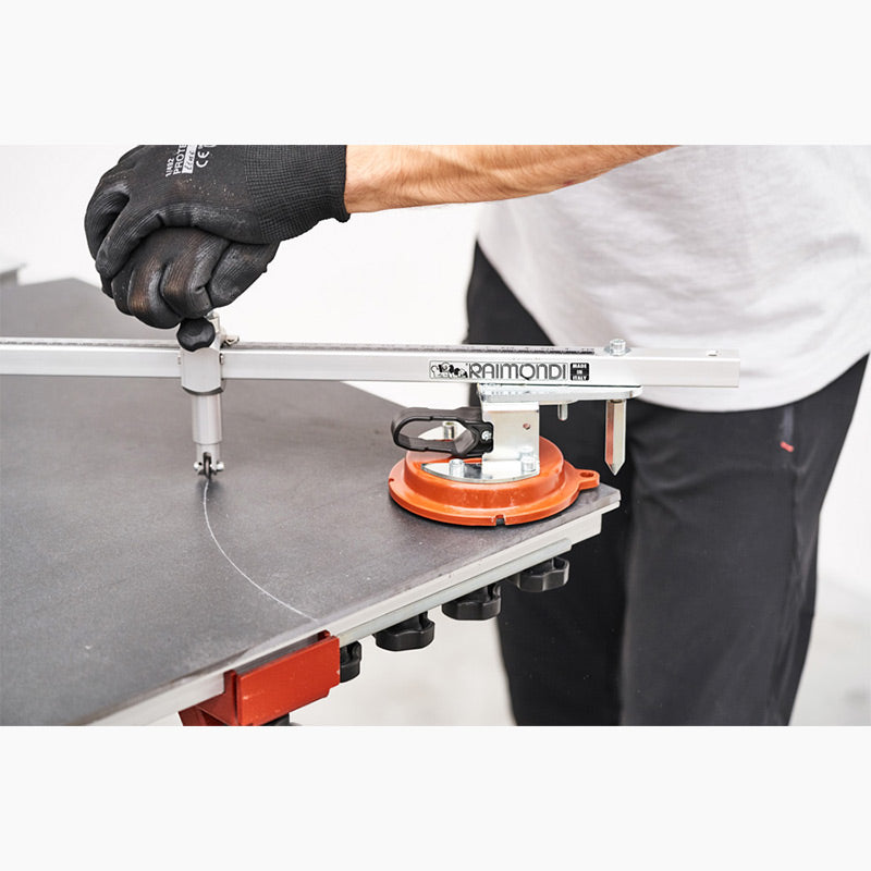 Dispositivo para executar perfurações circulares de grande diâmetro, em grandes placas, por incisão. Permite perfuração centralizada ou deslocada em relação à ventosa. Régua graduada com indicador do diâmetro do furo. Leve e fácil de transportar. Para completar a furação é quase sempre necessário fazer cortes transversais com uma esmerilhadeira e depois dividir as porções. Círculos completos, meios círculos, quartos de círculo ou arredondamentos de cantos podem ser executados.
