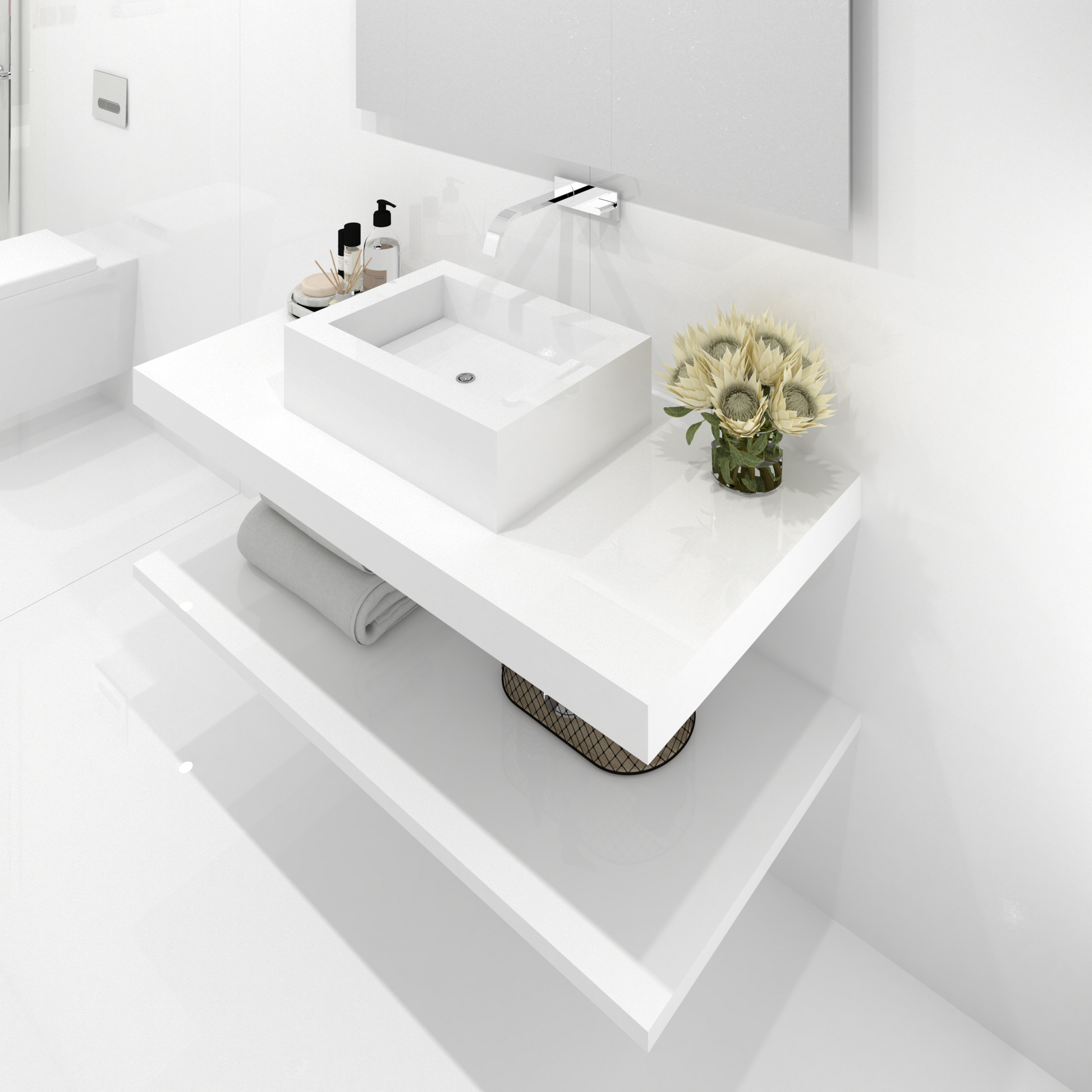 Observação: Ao adquirir nossa bancada, tenha a opção de adicionar uma prateleira inferior por um preço especial. As nossas prateleiras são projetadas para combinar perfeitamente com a bancada, proporcionando um espaço adicional elegante e prático para organizar seus produtos de higiene pessoal, toalhas e acessórios.