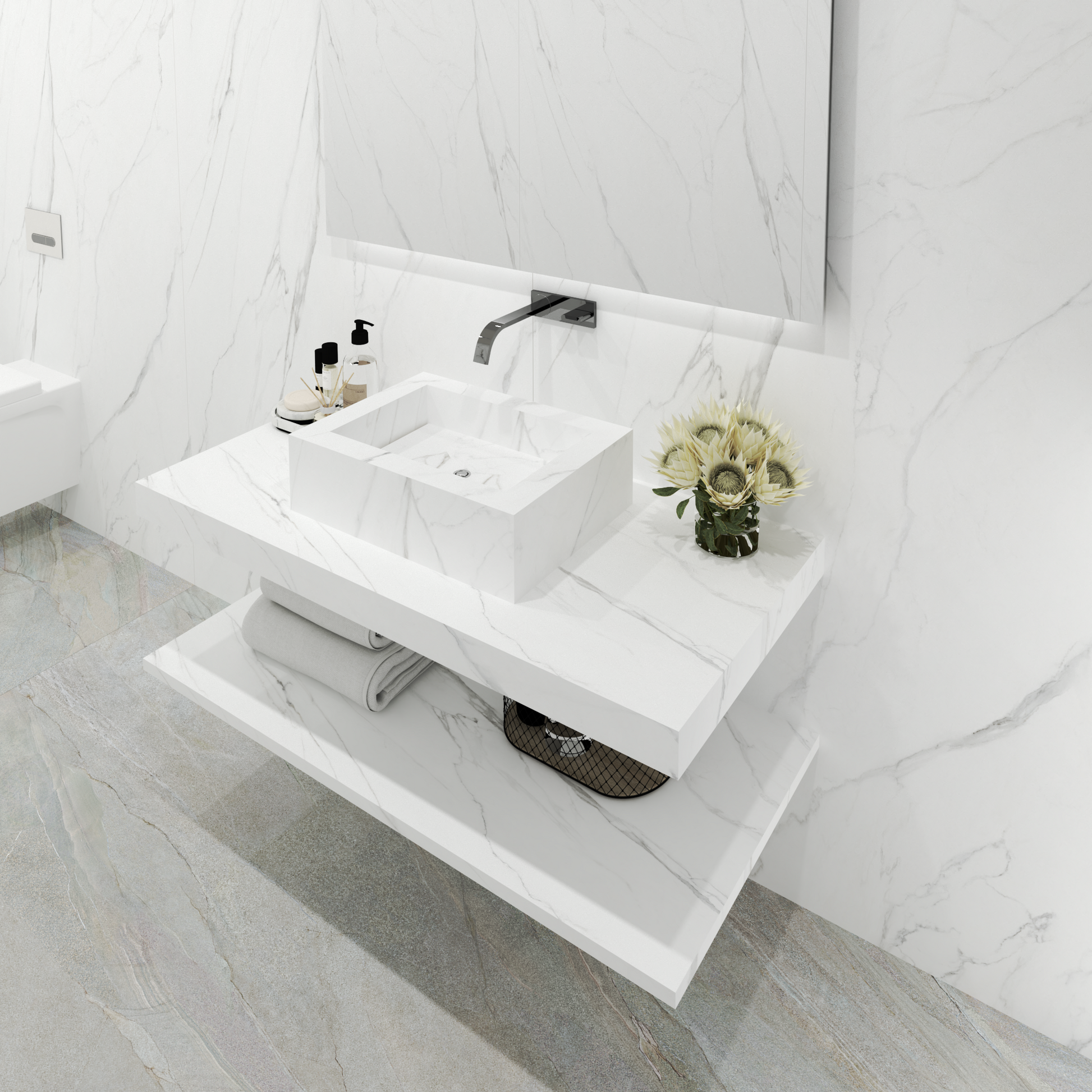 Observação: Ao adquirir nossa bancada, tenha a opção de adicionar uma prateleira inferior por um preço especial. As nossas prateleiras são projetadas para combinar perfeitamente com a bancada, proporcionando um espaço adicional elegante e prático para organizar seus produtos de higiene pessoal, toalhas e acessórios.