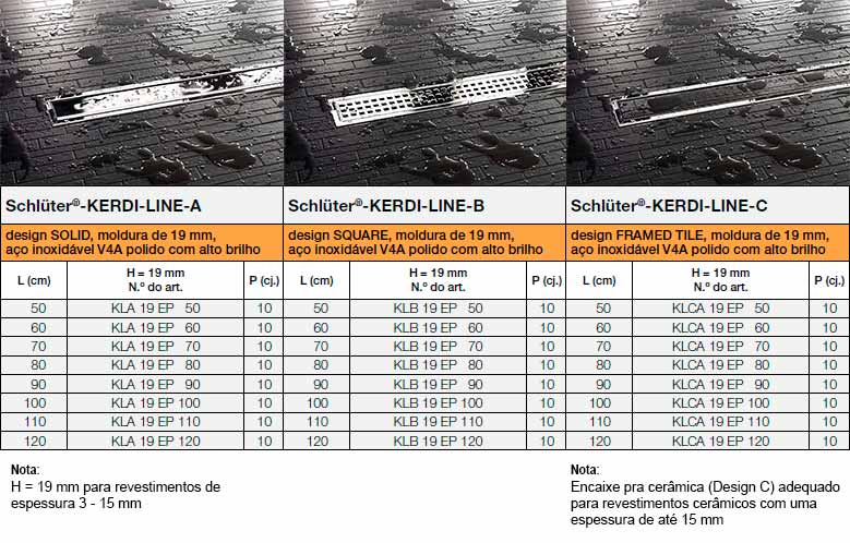 Schlüter-KERDI-LINE são remates de perfil opcionalmente em aço inoxidável escovado, aço inoxidável polido de alto brilho ou aço inoxidável lacado com coberturas clássicas, correspondentes aos corpos do canal Schlüter-KERDI-LINE. O remate de suporte é regulável de forma contínua em altura para material de suporte de 3–25 mm. As coberturas estão disponíveis nas variantes de design SOLID (A), SQUARE (B) e FRAMED TILE (C).