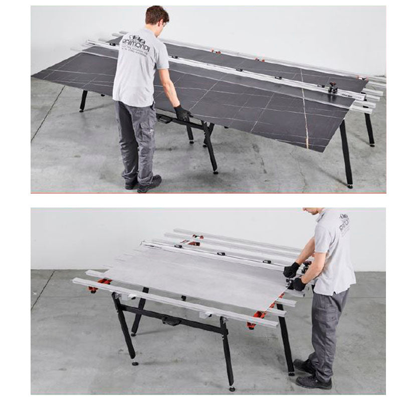 - A nova extensão basculante lateral suporta o azulejo e facilita a divisão após a marcação durante o processo de corte.